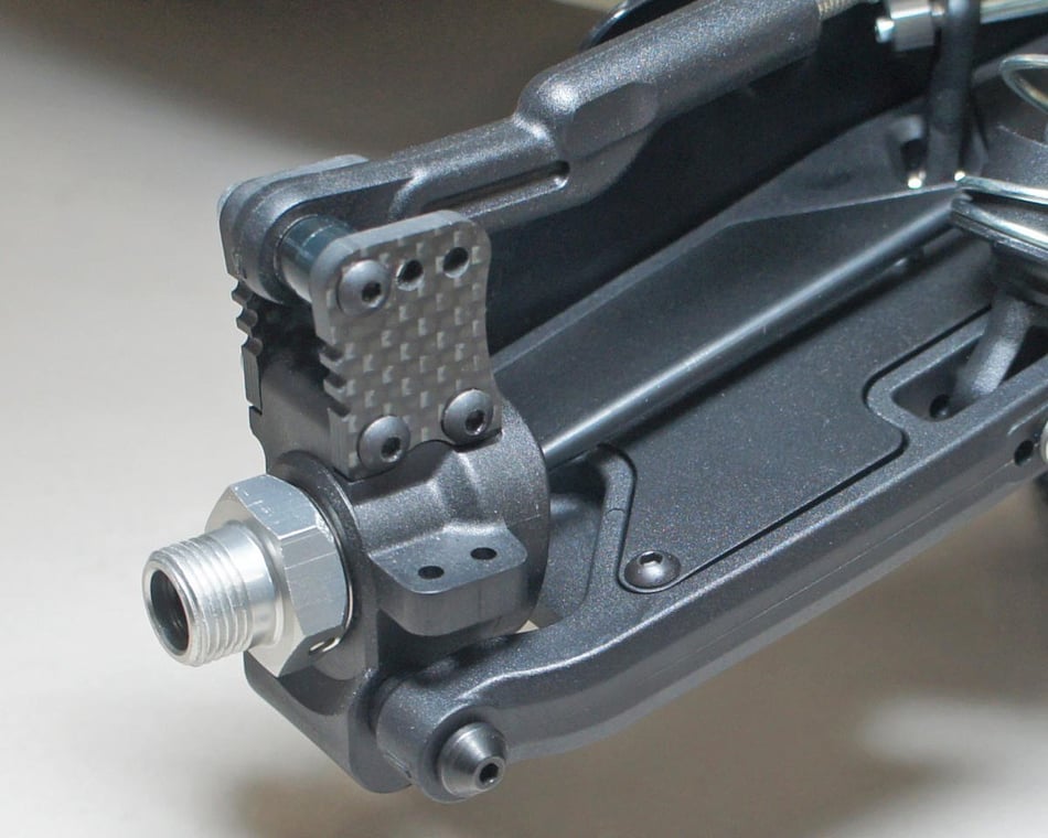 The “C” and “D” suspension mounts use square pills for increased tuning of toe-in, anti-squat, and geometry. The front and rear arms use an impact resistant material for increased durability. The molded uprights have carbon fiber plates to adjust the rear roll center.